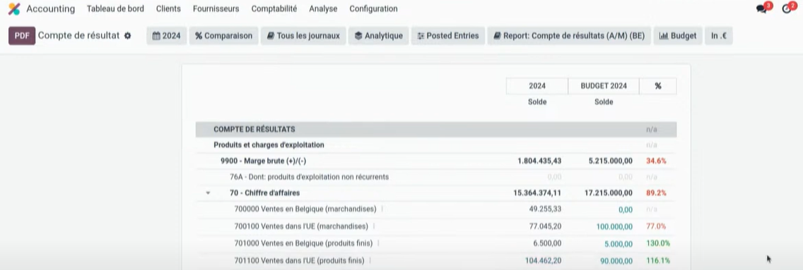 - Embed your financial budget into your P&L: Odoo allows you to display a "Budget" column next to actual results. Each line shows the planned amount, actual spending, and completion rate, which are updated automatically for the selected period.