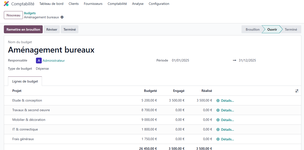 Budgeting can seem time-consuming, but follow-up is often the most challenging part. Not with Odoo. Its integrated modules (purchasing, sales, accounting) seamlessly synchronise actual expenses with your budget. - Real-time tracking: Instantly see gaps between forecasts and actuals through colour-coded alerts generated by Odoo.